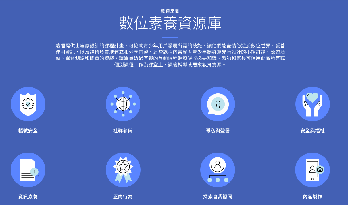 Facebook數位素養資源庫:協助青少年發展所需的技能,讓他們能盡情悠遊於數位世界、妥善運用資訊,以及謹慎負責地建立和分享內容。
