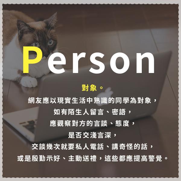 在社群軟體發達的今日,要結識同好或網友是相當容易的事。網友不一定就是壞人,我們也可以抱持著開闊的心態進行網路交友。然而,網路交友陷阱還是值得我們注意。因此要如何安全且讓人安心的在網路上擴大交友圈呢? 以下網路交友5口訣👋遵守”STOP”四條件保平安沒煩惱!